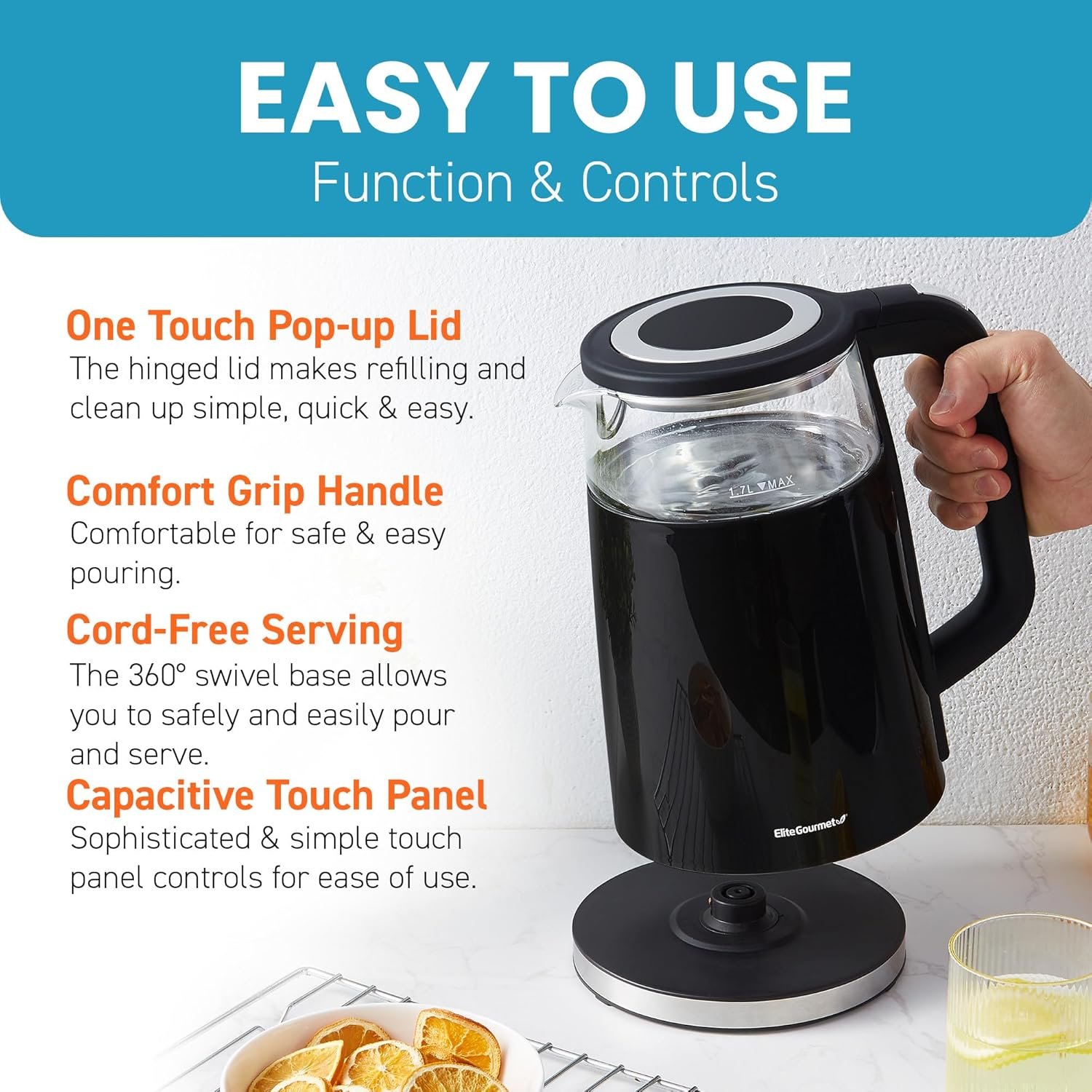 Upgrade your kitchen with the Elite Gourmet 1.7L Dual Wall Cool Touch Electric Tea Kettle, combining elegance and performance with a stylish borosilicate glass and stainless steel design. This kettle features a digital touchscreen with adjustable, pre-set temperatures for perfect tea, coffee, or quick meals, and keeps your water warm for up to 2 hours. Enjoy fast boiling in under 10 minutes, real-time temperature display, auto shut-off, and cool-touch safety. Ideal for any modern home, Elite Gourmet ensures quality, convenience, and peace of mind with BPA-free materials and responsive US-based support.