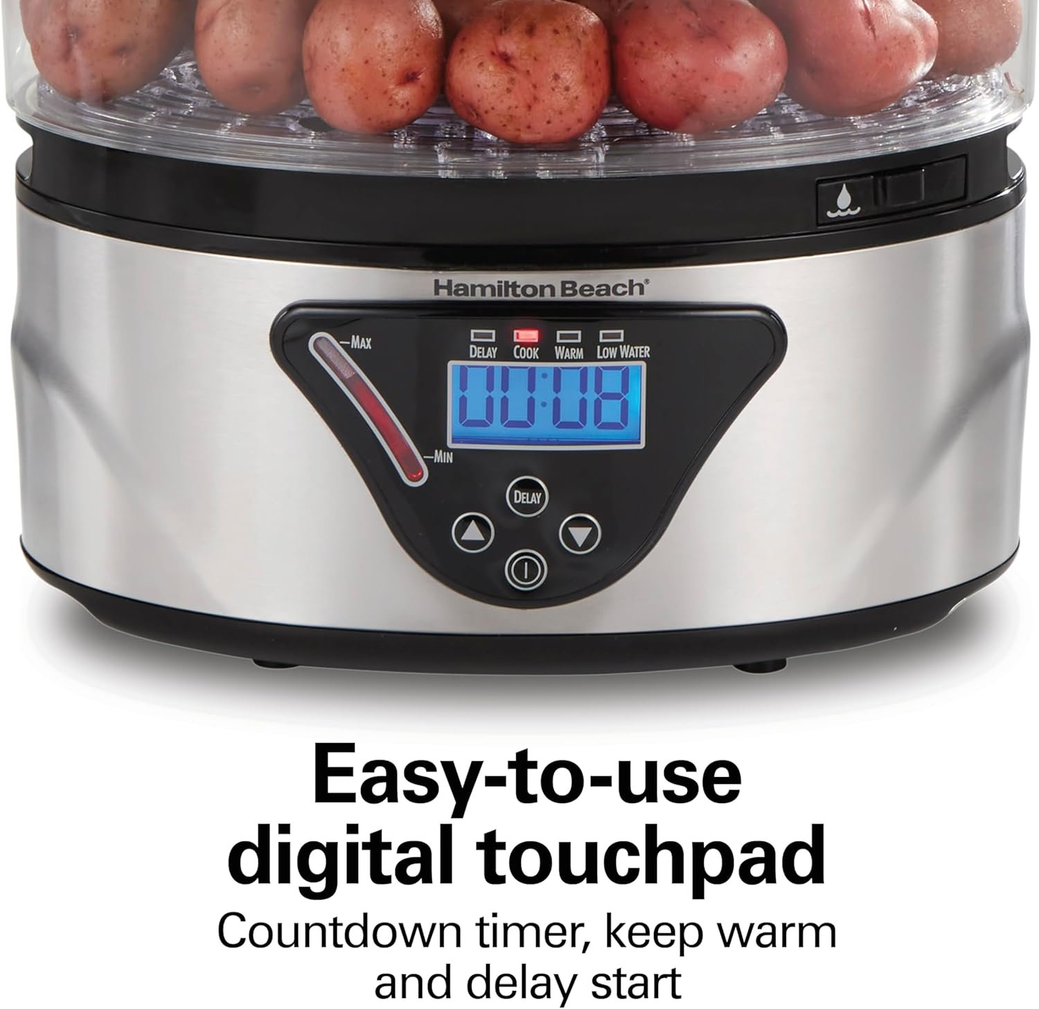 Compared to digital steamer competitors like the Oster Double Tiered Food Steamer and the Cuisinart Digital Glass Steamer, Hamilton Beach excels with its stackable two-tier setup and digital controls at a mid-range price point. This option is typically more compact and easier to store than the Cuisinart, and it’s a more affordable kitchen appliance than the Breville, while still offering reliable auto shutoff and quick meal functionality.