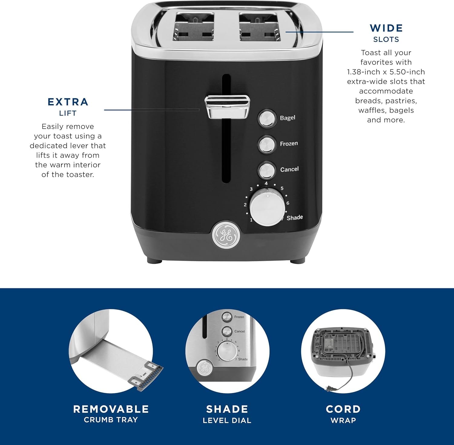 Many consumers have praised the GE 2 slice toaster’s extra wide slots and easy controls. The black stainless finish adds a touch of elegance, while 7 adjustable shade settings allow everyone in the family to enjoy their preferred toast darkness. According to GE, this model was designed for even heating and ease of cleaning, making it a reliable daily companion for breakfast and snack times.