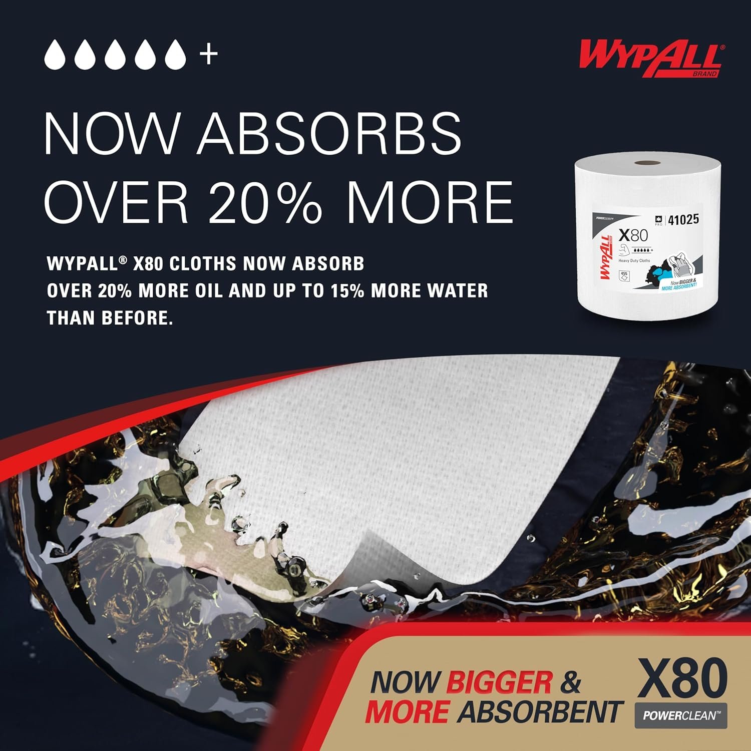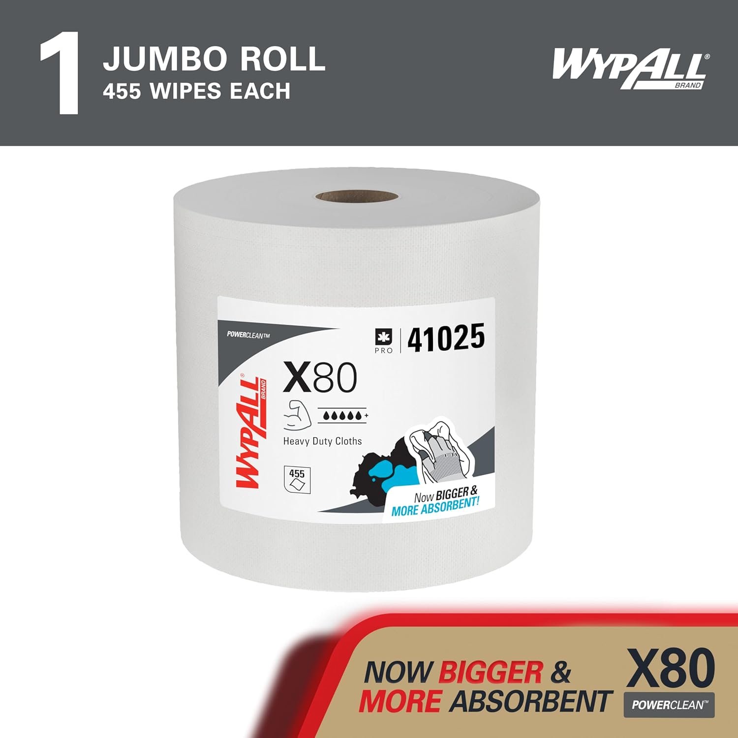 The WypAll PowerClean X80 Cloths Heavy Duty Wipes from Wypall offer exceptional cleaning power with 455 sheets per jumbo roll, designed for extended use. These heavy-duty wipes absorb over 20% more oil and 15% more water than before, staying strong and fast-absorbing both wet and dry. Perfect for tackling abrasive surfaces, machine and tool wiping, and large industrial spills, they feature a tough, precision-engineered texture that produces 3x less lint than rental shop towels. Ideal for professionals seeking reliable, high-performance cleaning solutions.