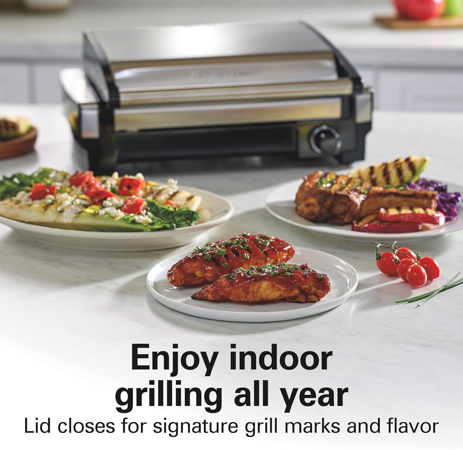 - Sturdy, Countertop-Friendly Design: Stainless steel build, compact enough for any kitchen countertop grill setup. The grill with lid seals in moisture, producing authentic grill marks.